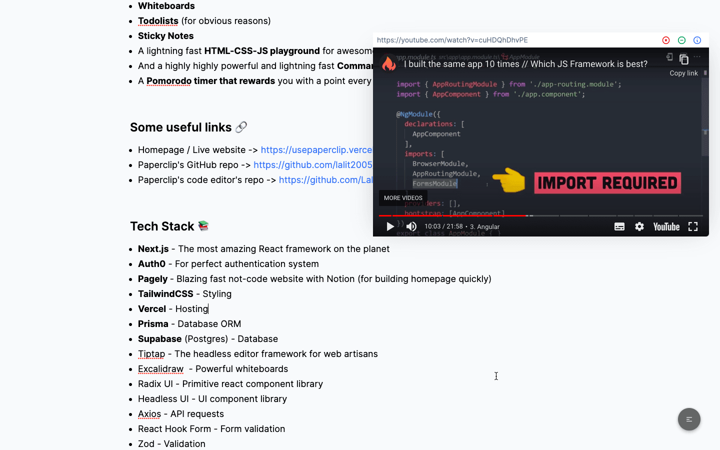 And as I was writing the blog in Paperclip, I caught some nasty bugs which I was able to solve successfully. I had almost the similar experience with Notion except for the / command. So I'll be removing the toolbar soon and adding the "popup on /" feature. Thanks to this awesome blog. And I wrote this blog while watching this cool video from Fireship